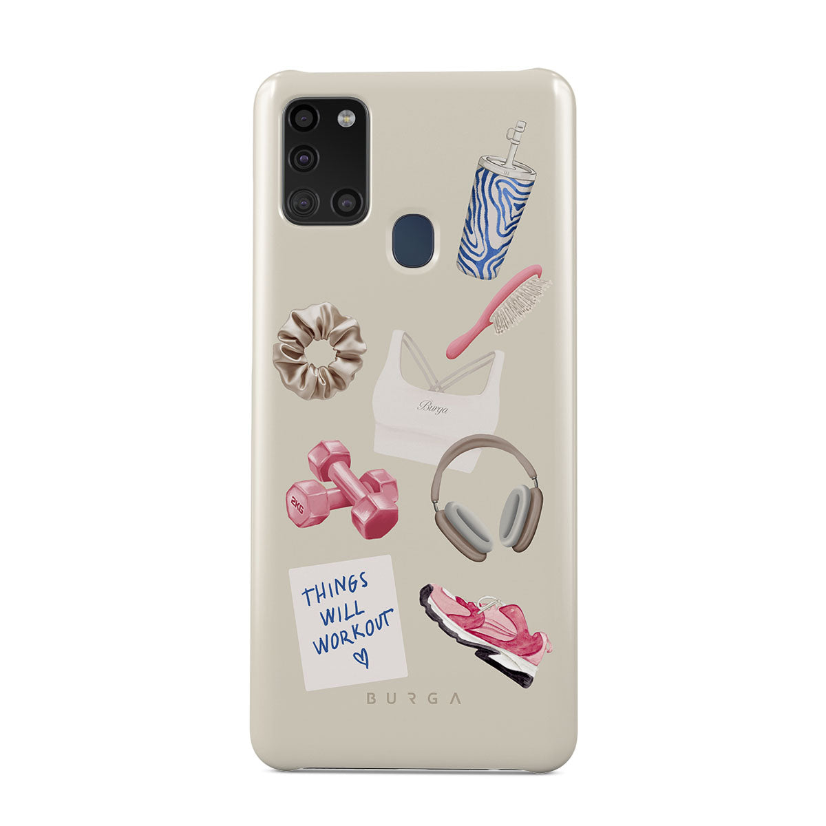 This design features: dumbbells, headphones, tumbler, hairbrush, pink trainers, sports bra, crunchie, "Things Will Work Out" sticky note