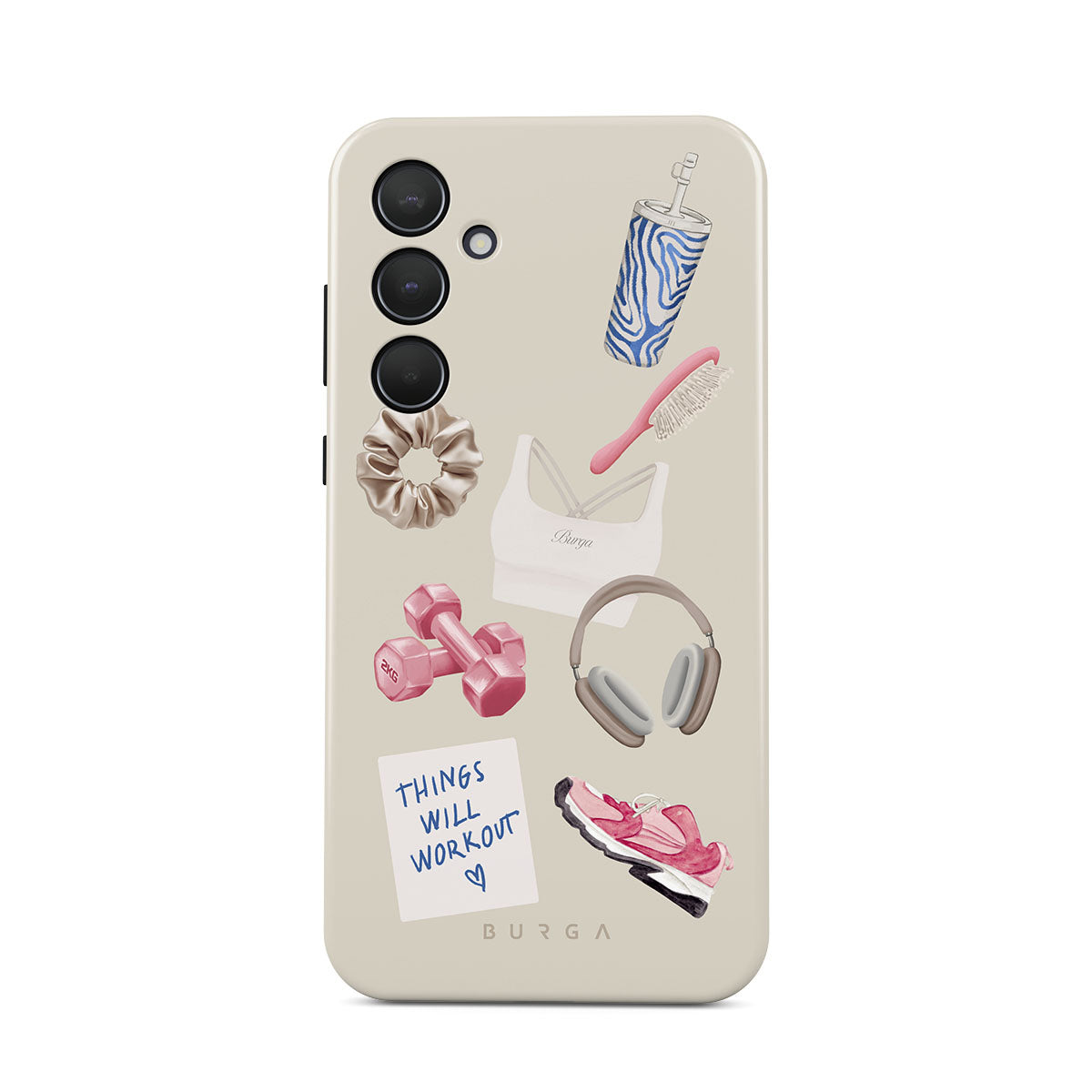 This design features: dumbbells, headphones, tumbler, hairbrush, pink trainers, sports bra, crunchie, "Things Will Work Out" sticky note