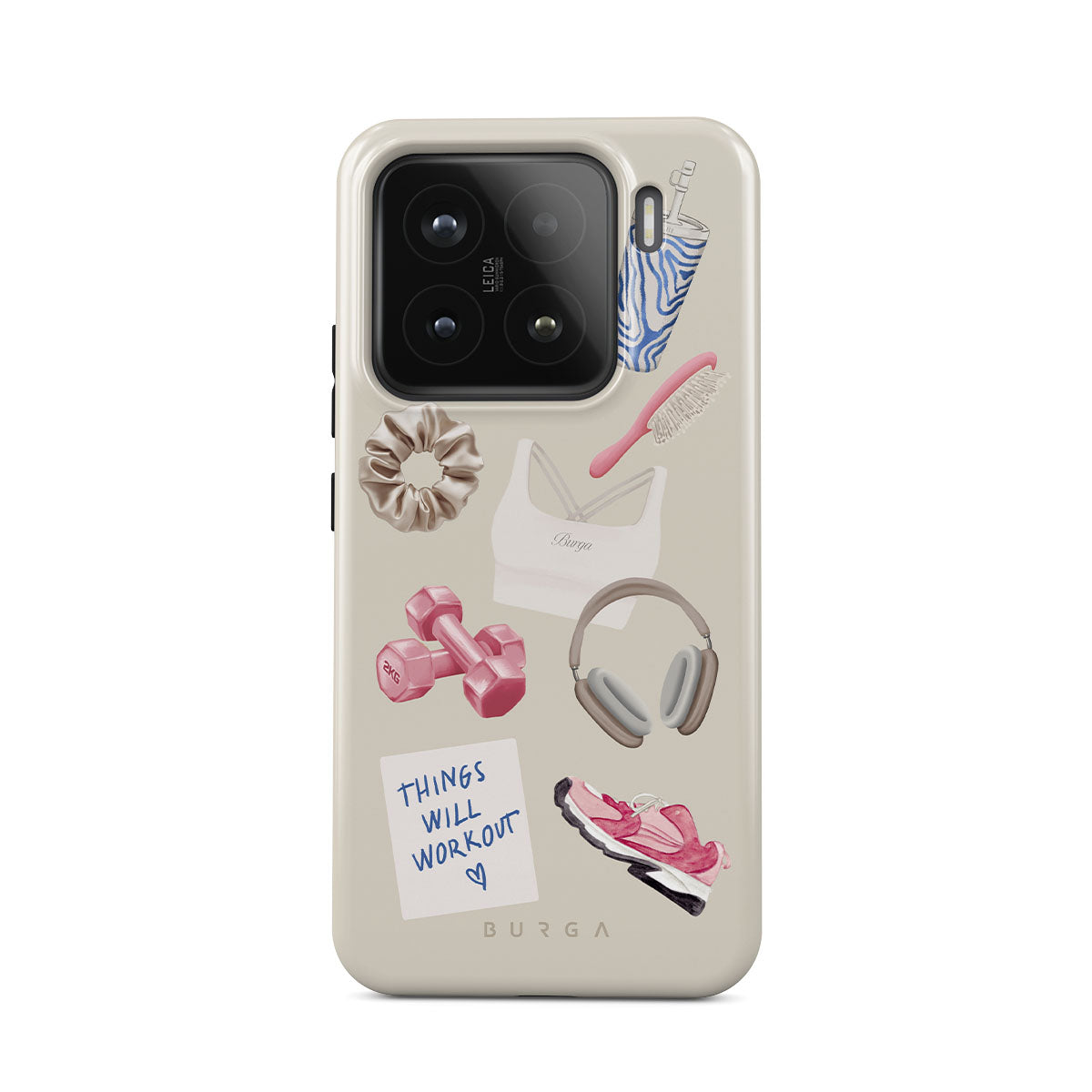 This design features: dumbbells, headphones, tumbler, hairbrush, pink trainers, sports bra, crunchie, "Things Will Work Out" sticky note