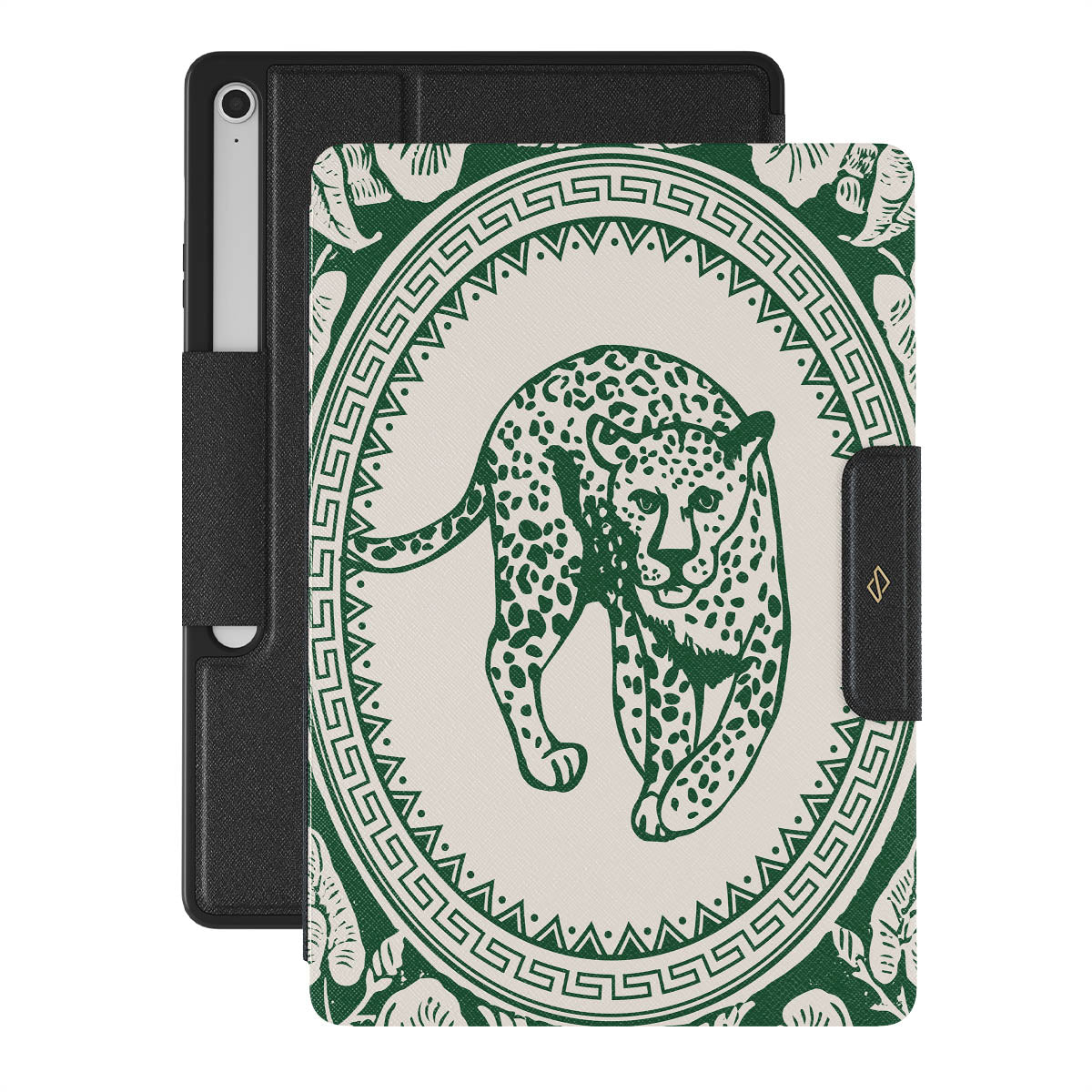 Our Antique Samsung Galaxy Tab S10+ FE folio case design—a nude canvas kissed by refined green contours, painting an eternal saga of elegance. Enthroned at its center is a regal leopard embraced by a tender floral caress. A nod to timeless opulence, this design captures the essence of vintage prestige.