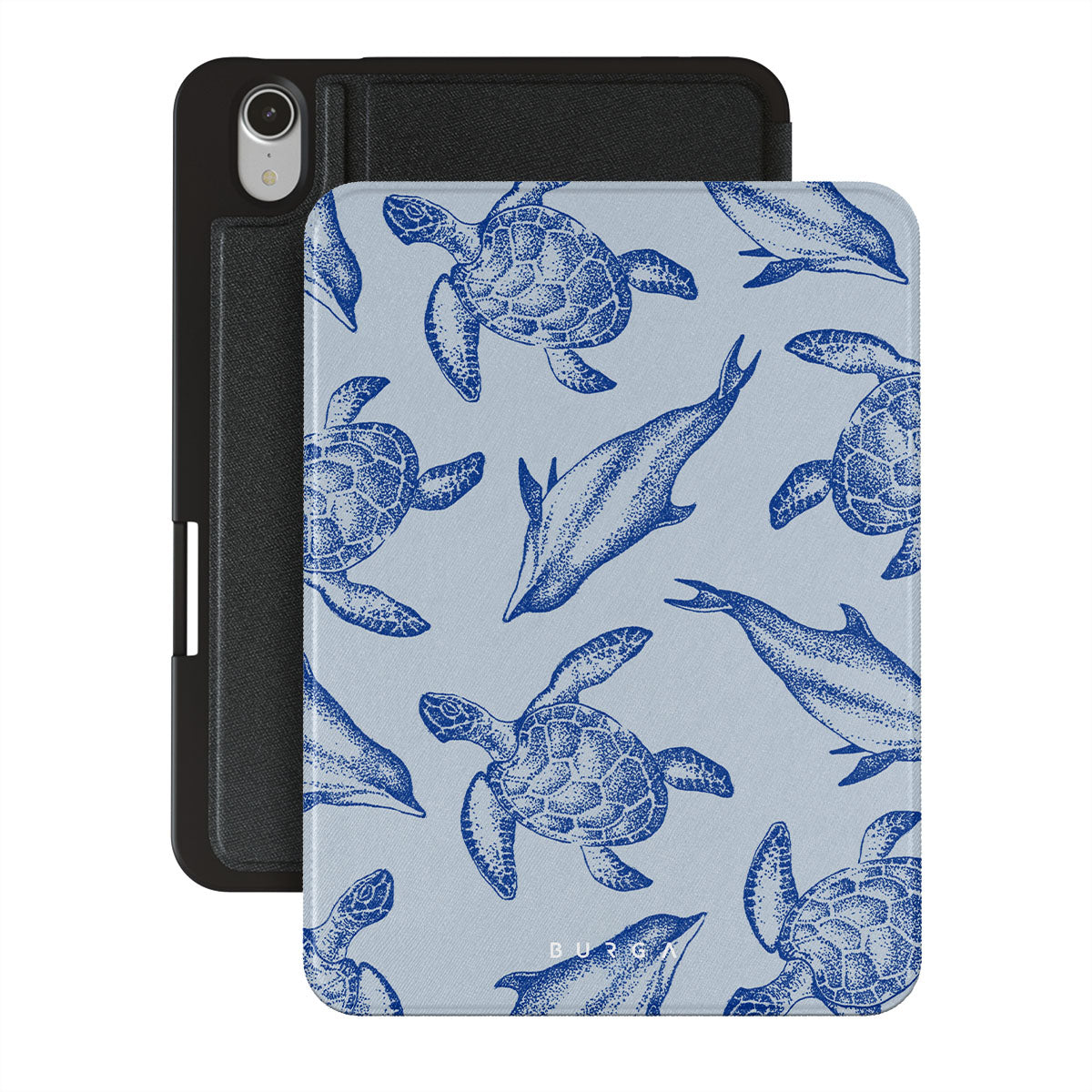 A beautiful design featuring lively turtles and dolphins playfully dancing in serene light blue water. Dive into the ocean's rhythm with our Aquatic Dance iPad Mini 8.3 (A17 Pro/6th Gen) 2021 folio case.