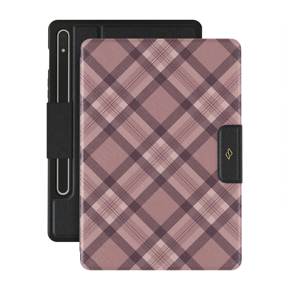 Made for those who hustle hard and look sharp. Our ASAP Samsung Galaxy Tab S9+ folio case design features a sleek rosé-gray background with diagonal plaid in soft grey and deep pink—mixing modern flair with understated elegance. For the pros who know that style and speed go hand-in-hand.