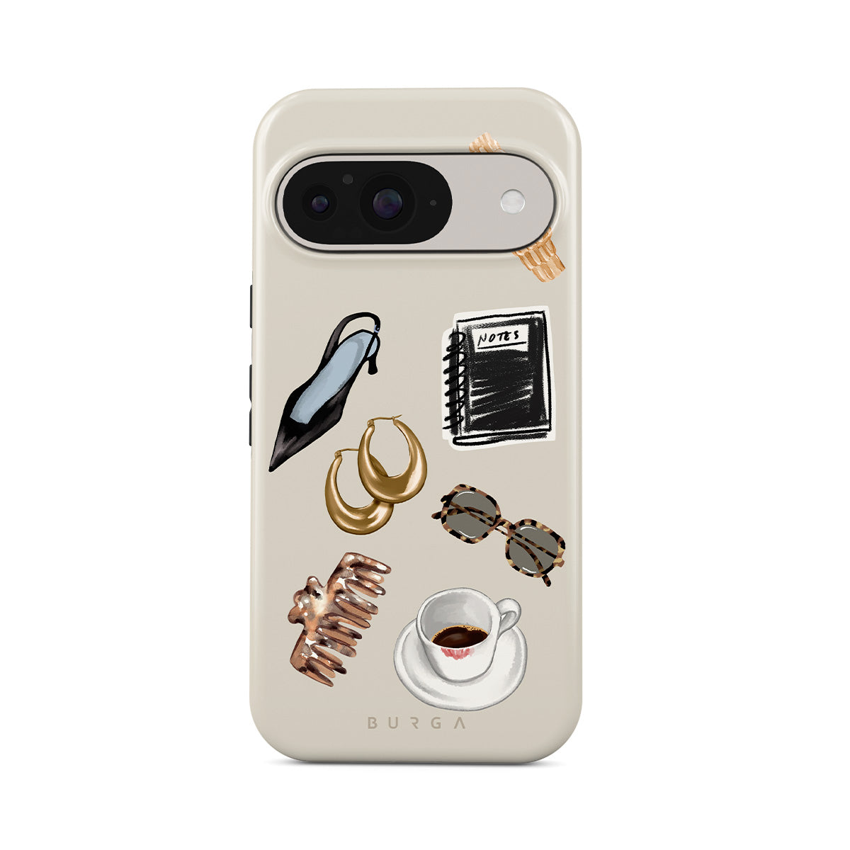 This design features: black high heel, gold hoop earrings, black notebook, coffee cup, tortoiseshell glasses, brown scrunchie, retro gold watch