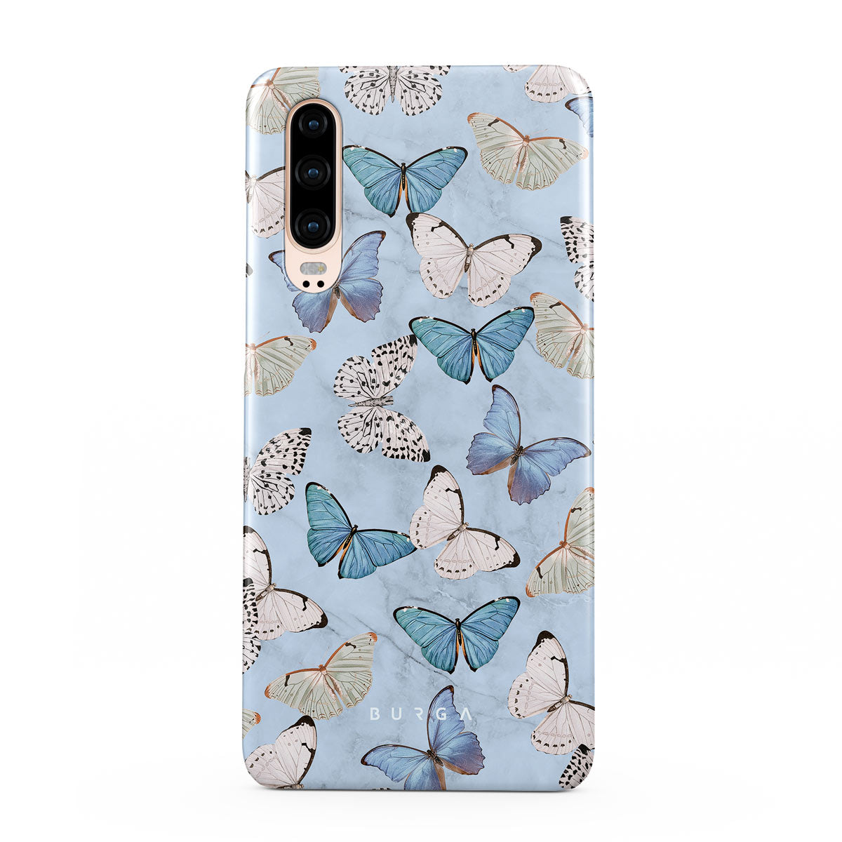Pastel blue and a playful pattern of summery butterflies create a dreamy combination in our Huawei P30 phone case. Carry the feeling of the butterflies in your stomach while protecting your phone from any dangers, as the hard-shell case will keep it sound and safe.