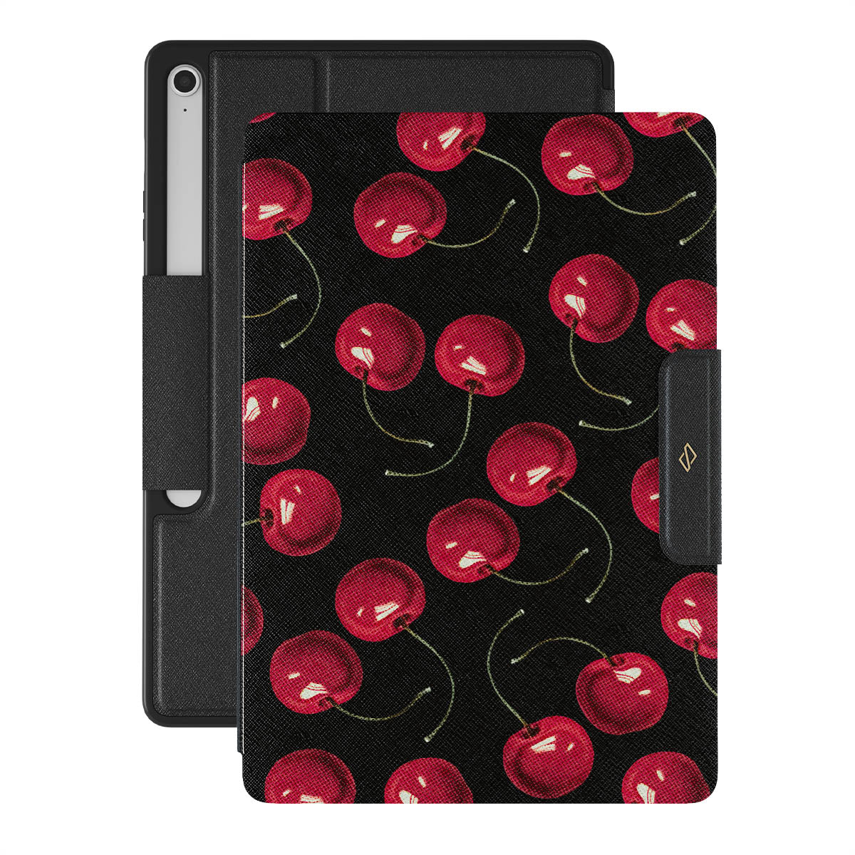 On a deep black background, rich red cherries stand out. Tempting and audacious, our Cherrybomb Samsung Galaxy Tab S10+ FE folio case design is perfect for anyone who likes to keep things simple yet striking.