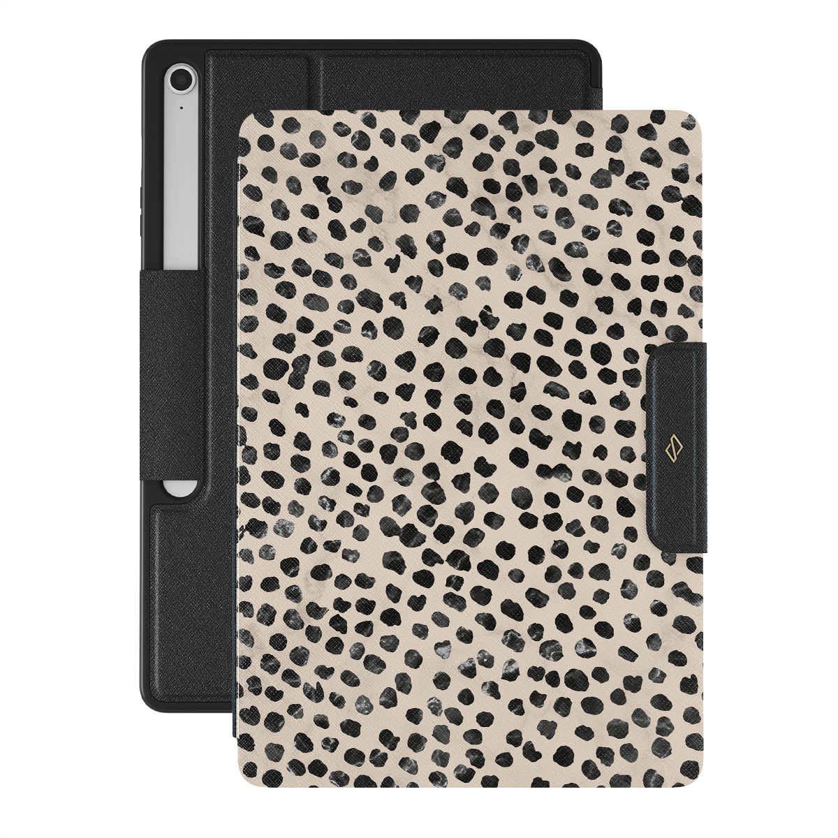 Cute cream color as a background for the unique pattern of asymmetrical black spots creates a real eye-catcher in our Almond Latte Samsung Galaxy Tab S10+ FE folio case. The spotted pattern adds a touch of luxury to your Galaxy Tab, while the case's hard-shell nature offers much-needed protection making it a popular choice between fashion lovers.