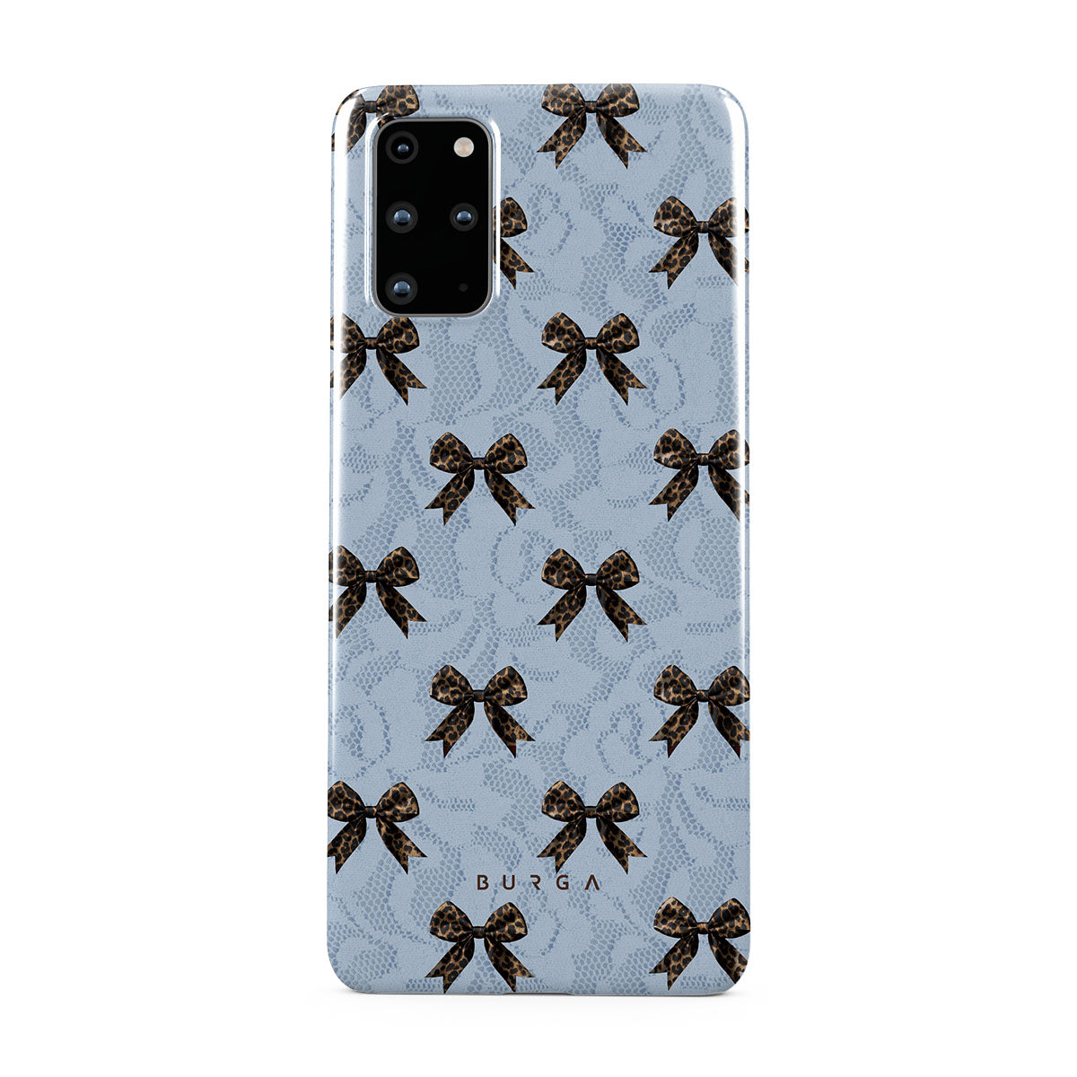 For those who command attention with subtle elegance, our Fashionista Samsung Galaxy S20 Plus 4G / 5G phone case design is your go-to. A soft blue background, accented by dark grey bows and subtle lace patterns, exudes polished, effortless style. It's quiet confidence with a hint of charm.