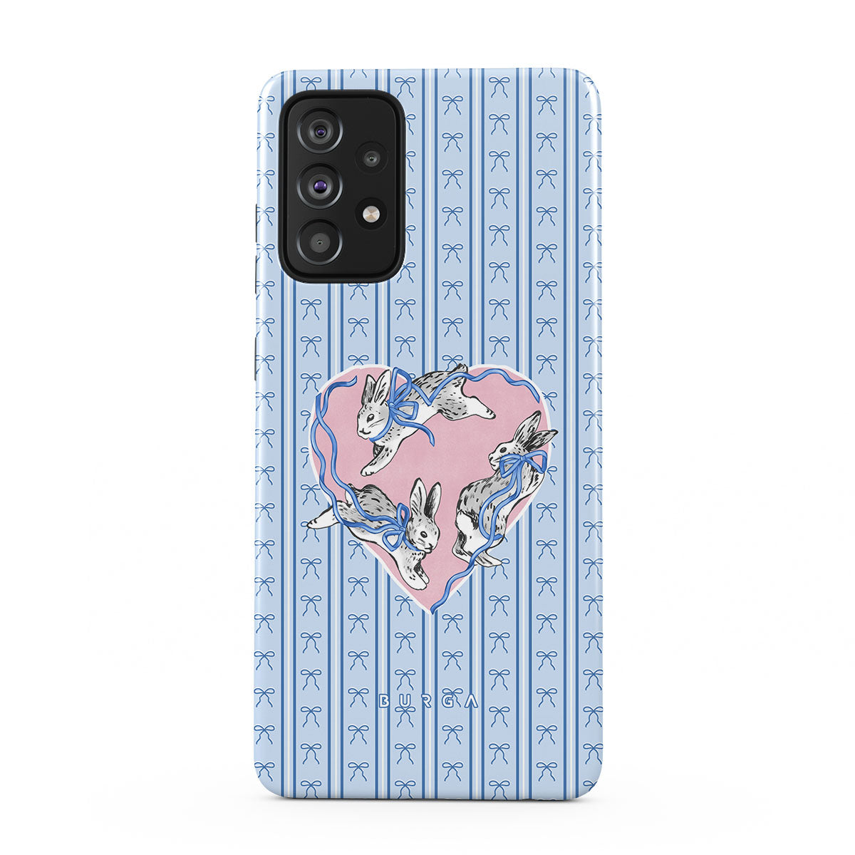 This design features: white rabbits, heart frame, blue stripes