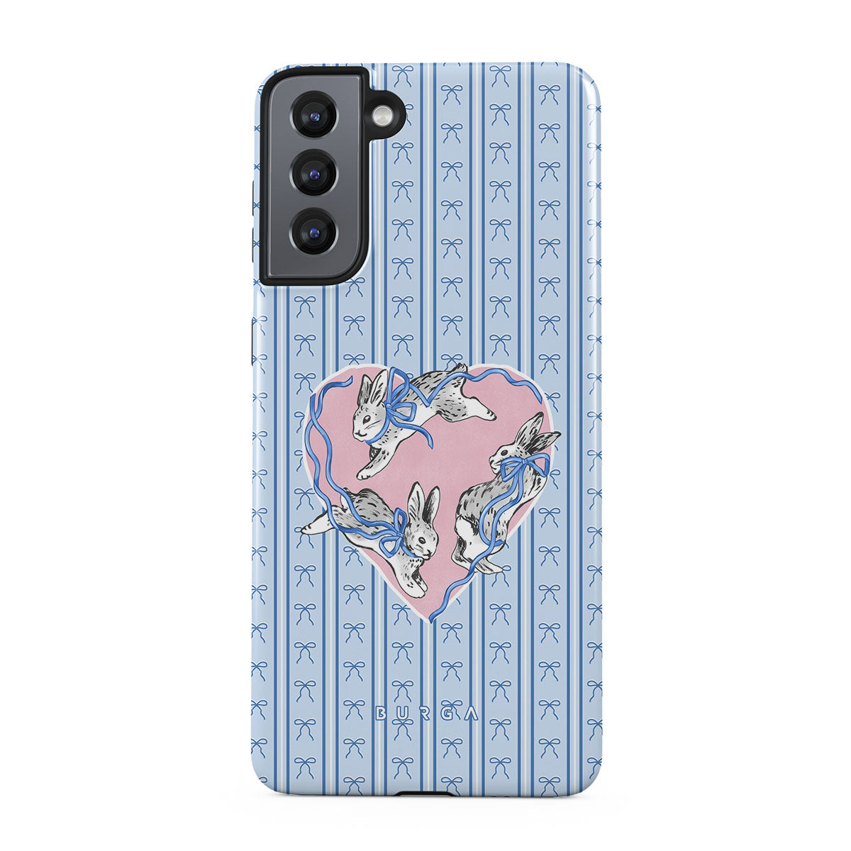 This design features: white rabbits, heart frame, blue stripes