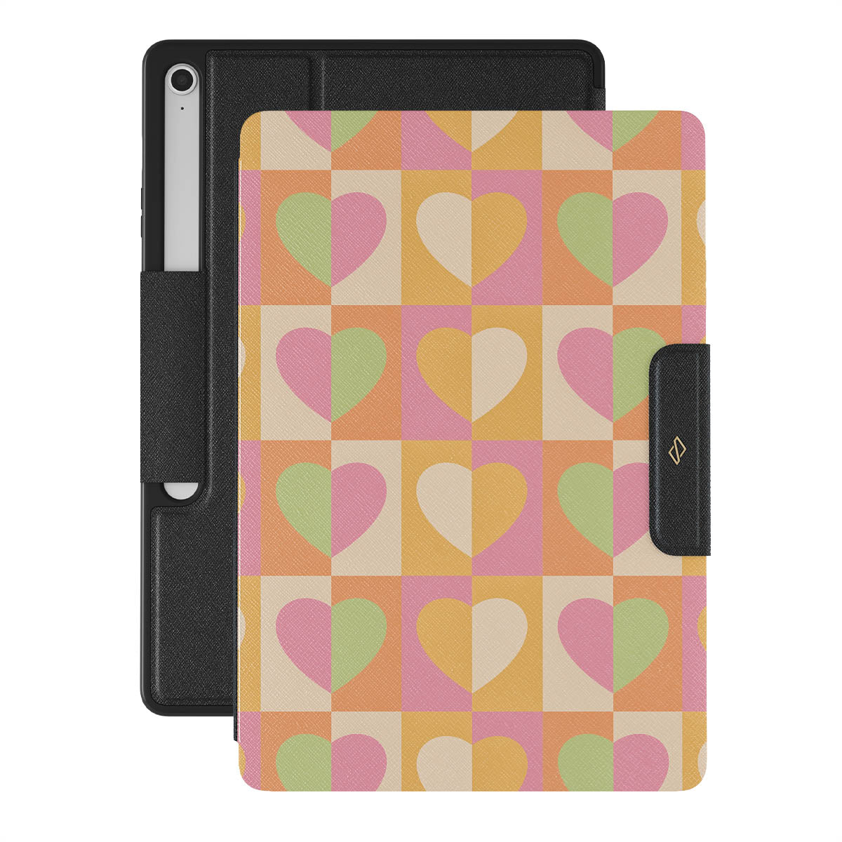 Beautifully geometrical and lovable Summer Love {Galaxy Tab Model} Samsung Galaxy Tab S10+ FE folio case combines a soft pastel color scheme with a playful square heart pattern. Adding a touch of love to your style was never easier! Keep your Galaxy Tab as safe as you keep your heart in a cheeky checkered protective Galaxy Tab case!