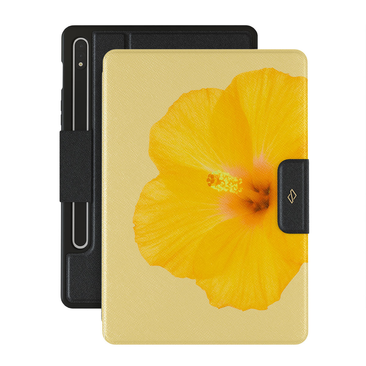 Our Hibiscus Samsung Galaxy Tab S8/S7 folio case features a striking design with a large, vibrant yellow hibiscus flower on a matching yellow background. This tropical flower pattern exudes a sense of warmth and exotic beauty, perfect for those who love nature-inspired and floral aesthetics.