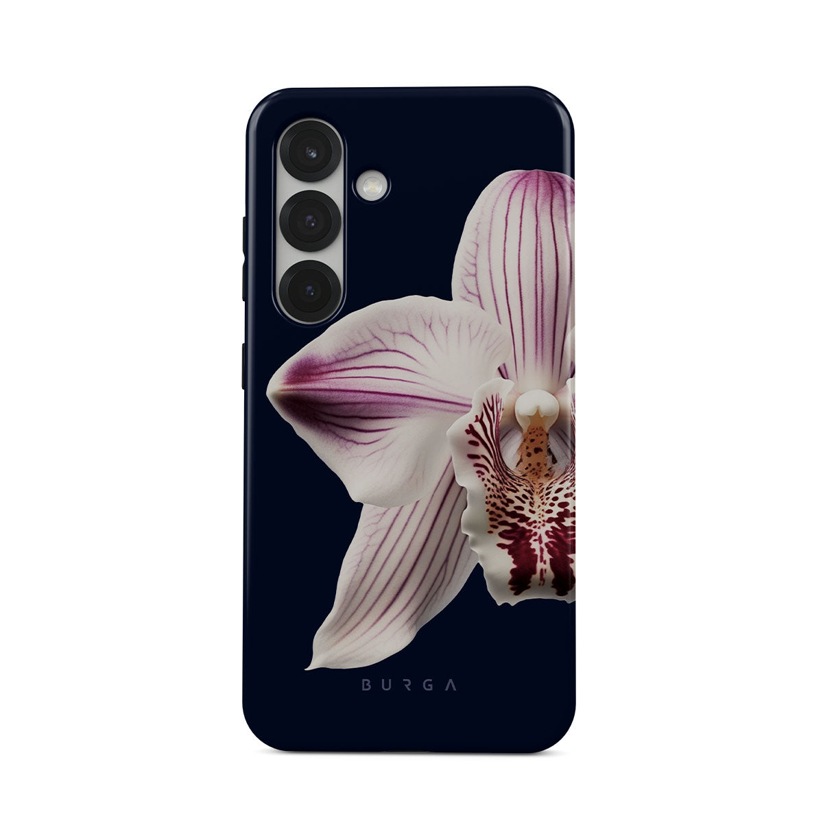 The white orchid blooms boldly upon a night sky blue, a beacon of clarity in the darkness. Our Nectar Samsung Galaxy S25 Plus phone case design speaks to the soul's desire to find light within, to illuminate the hidden paths of self-discovery that only reveal themselves under the cloak of introspection.
