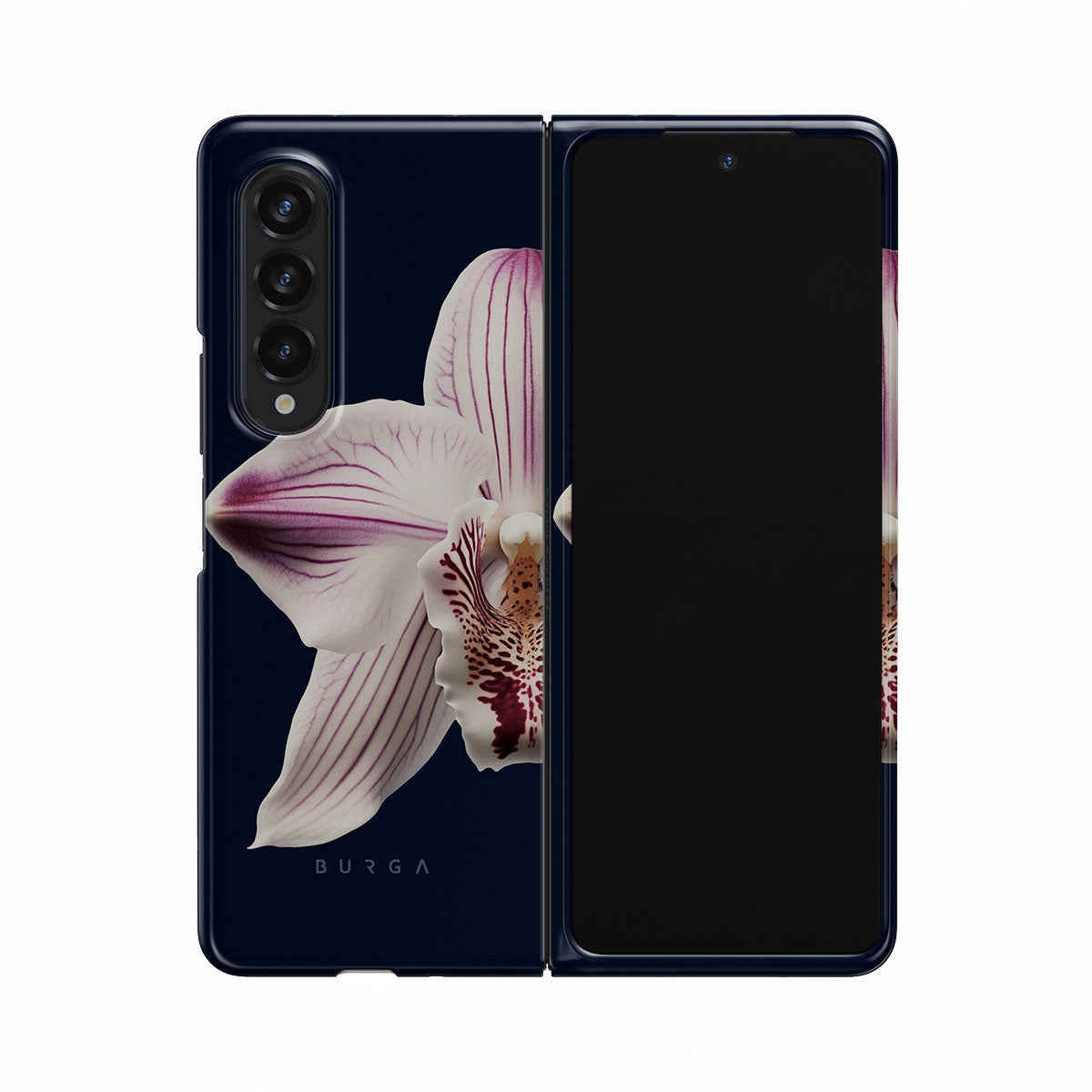 The white orchid blooms boldly upon a night sky blue, a beacon of clarity in the darkness. Our Nectar Samsung Galaxy Z Fold 3 phone case design speaks to the soul's desire to find light within, to illuminate the hidden paths of self-discovery that only reveal themselves under the cloak of introspection.