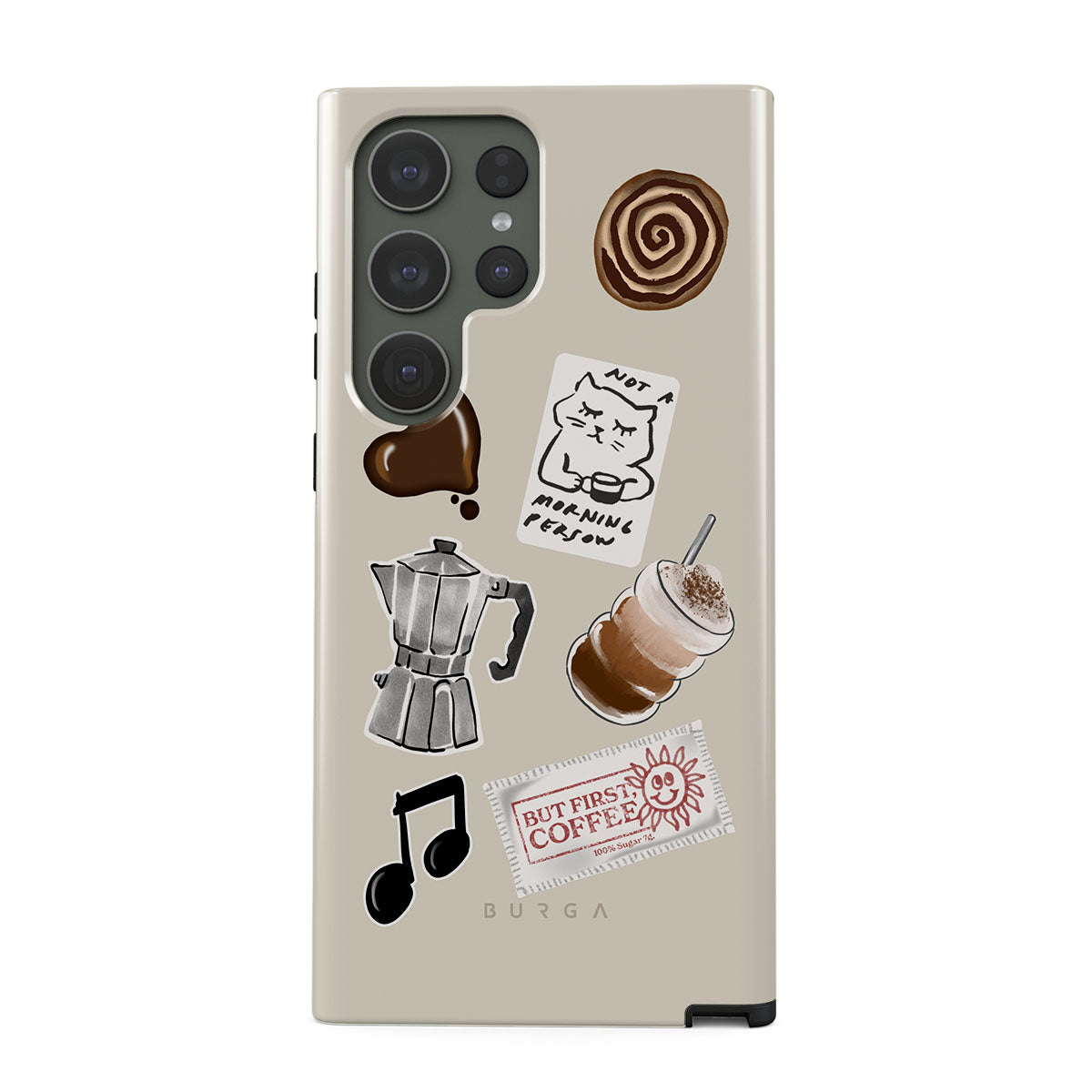 This design features: moka pot, frappe, cinnamon roll, chocolate heart, "Not a morning person" sticker, "But First, Coffee" receipt, music note
