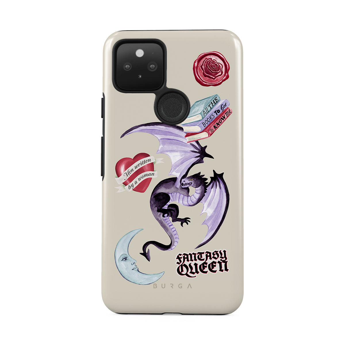 This design features: purple dragon, "Fantasy Queen" sticker, crescent moon, purple wax seal, heart with message, books