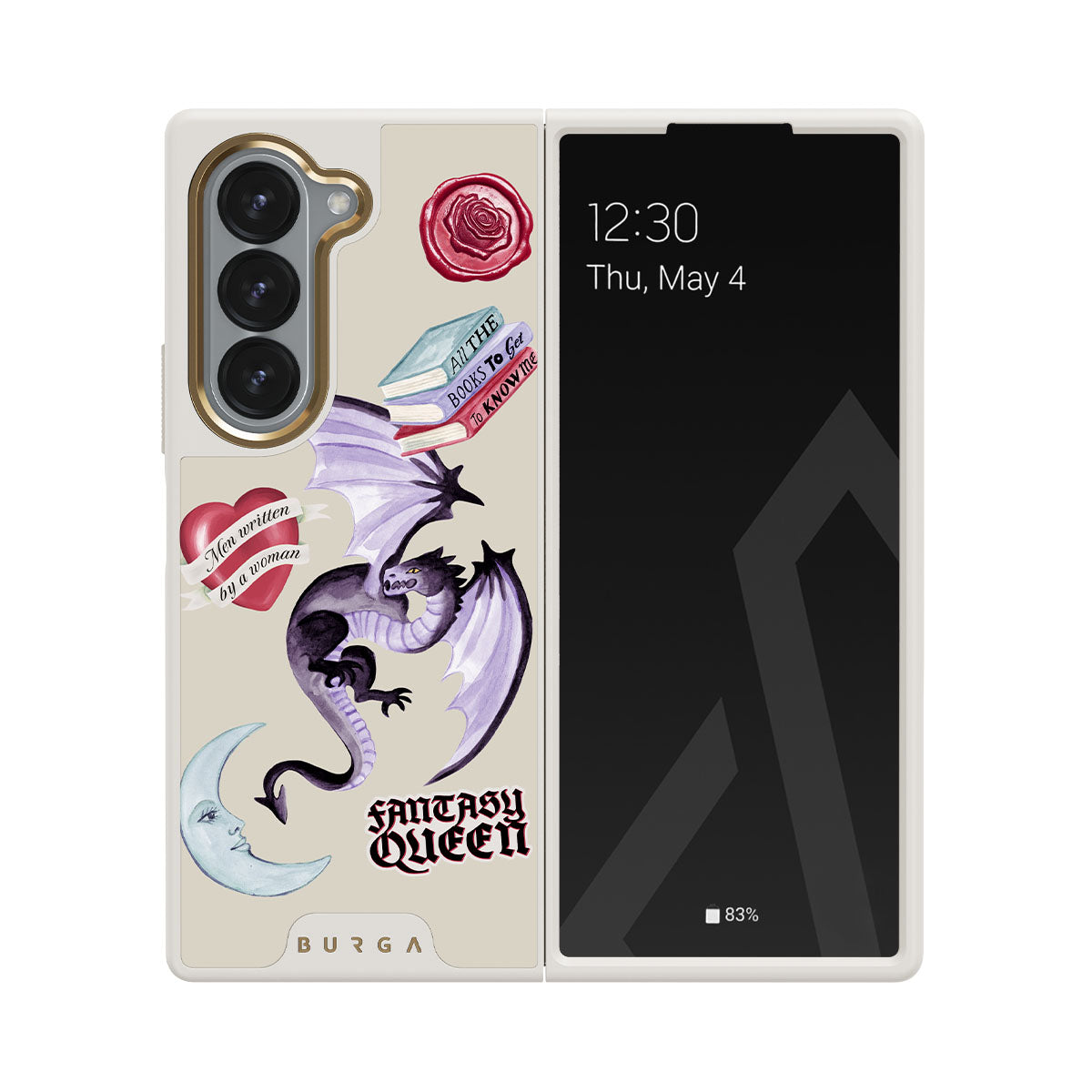 This design features: purple dragon, "Fantasy Queen" sticker, crescent moon, purple wax seal, heart with message, books