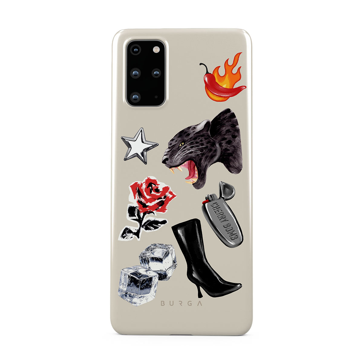 This design features: black panther, red rose, burning bell pepper, silver lighter, black knee-high boots, ice cubes, silver star