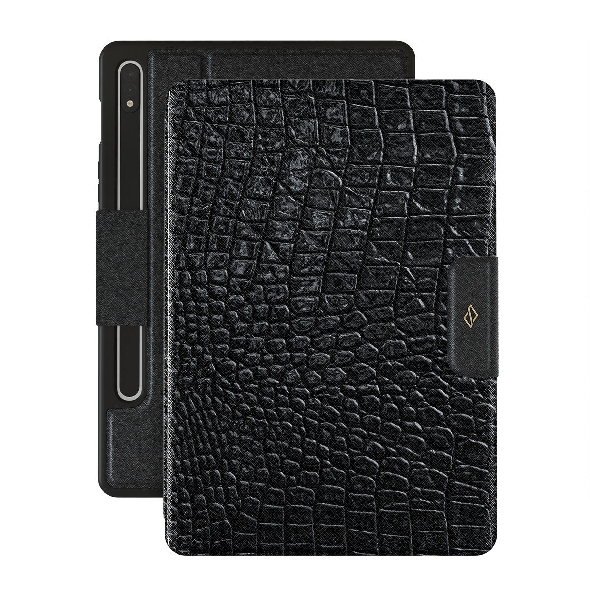 Our Reaper's Touch Samsung Galaxy Tab S9+ folio case cover features a classic snakeskin design in dark black. The dangerous animal print will add confidence and a touch of luxury to your style while transforming your Galaxy Tab into a fashion accessory.