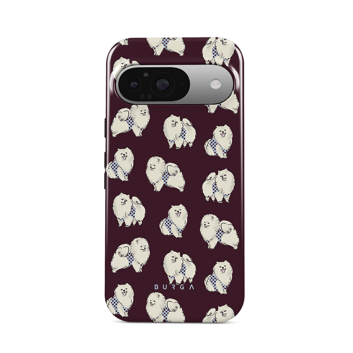 This design features: white fluffy dogs on a deep burgundy background, poodles, pets.
