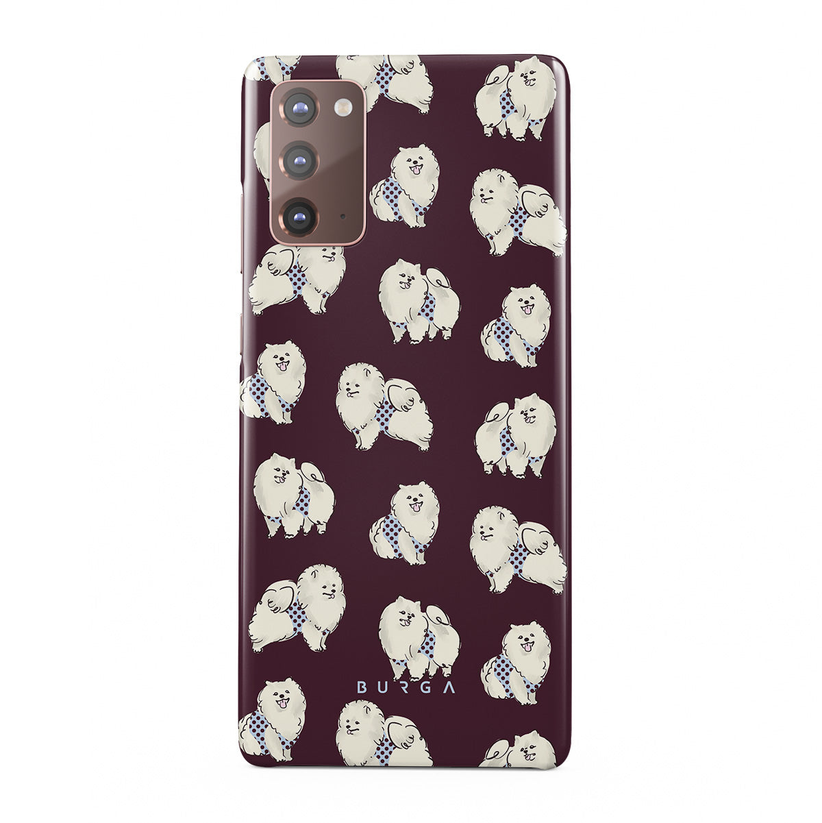 This design features: white fluffy dogs on a deep burgundy background, poodles, pets.