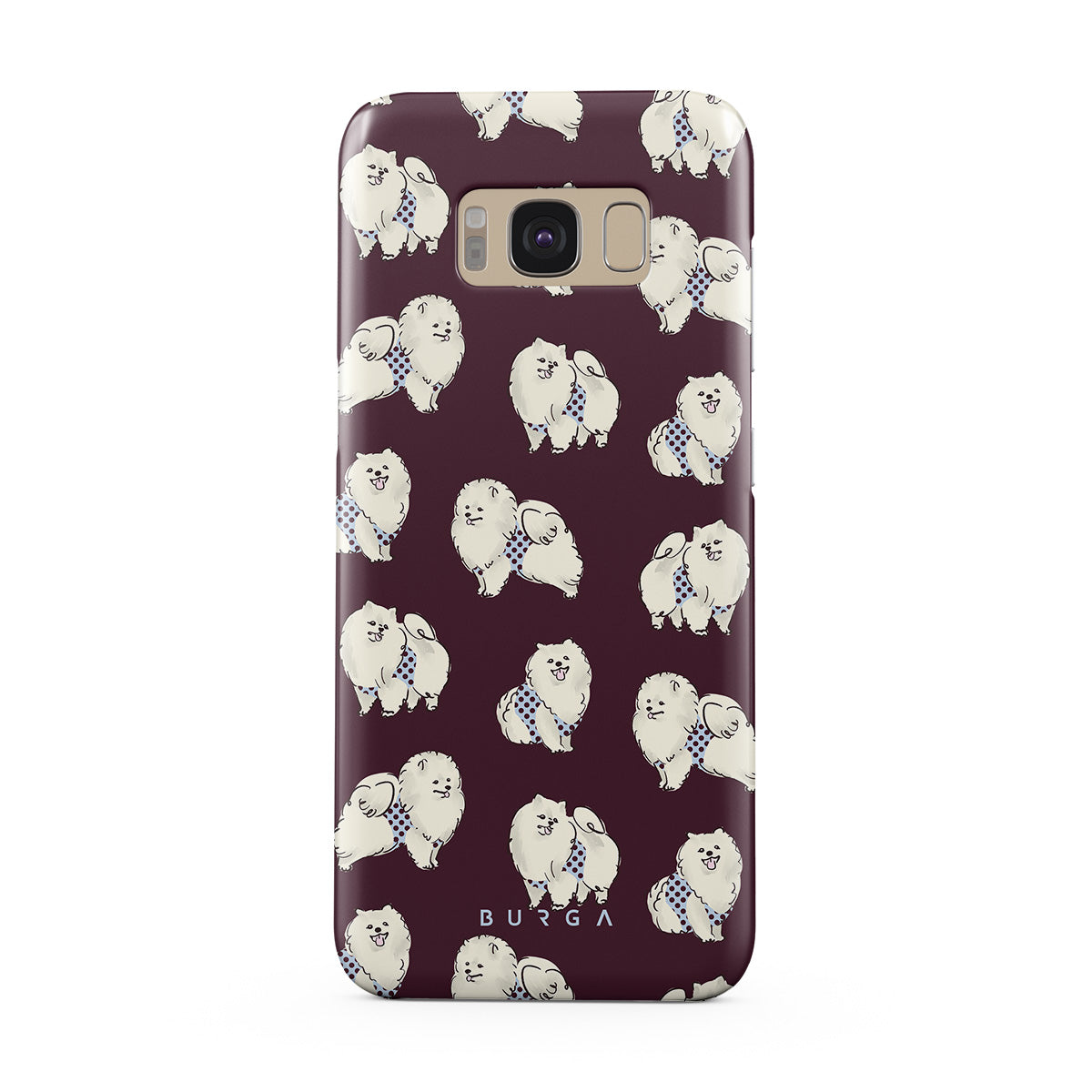 This design features: white fluffy dogs on a deep burgundy background, poodles, pets.