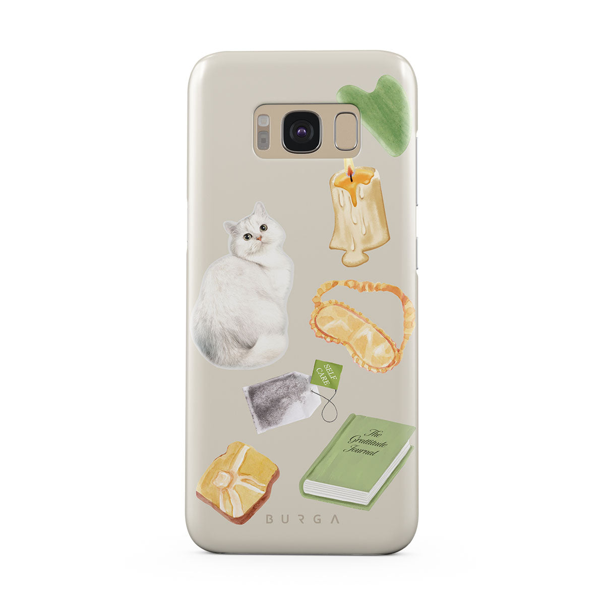 This design features: white cat, green book, candle, Gua Sha bar, sleeping mask, tea bag, yellow crystal