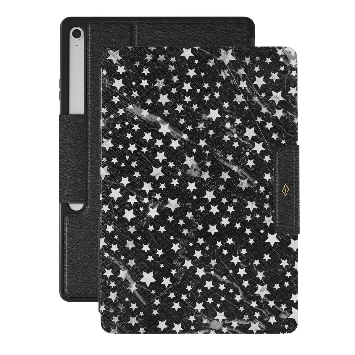 Dark, endless with flickering stars, the Starry Night Samsung Galaxy Tab S10+ FE folio case is inspired by the sky above us. Here the charming star pattern meets with a trendy black and white marble. Add the unique combination to your wardrobe and transform your protective Galaxy Tab case cover into a fashion accessory.