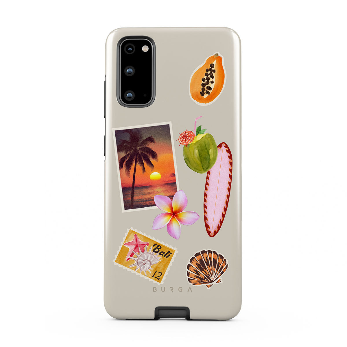 This design features: tropical sunset photo, papaya, green coconut, pink surfboard, pink plumeria flower, orange shell, Bali postcard