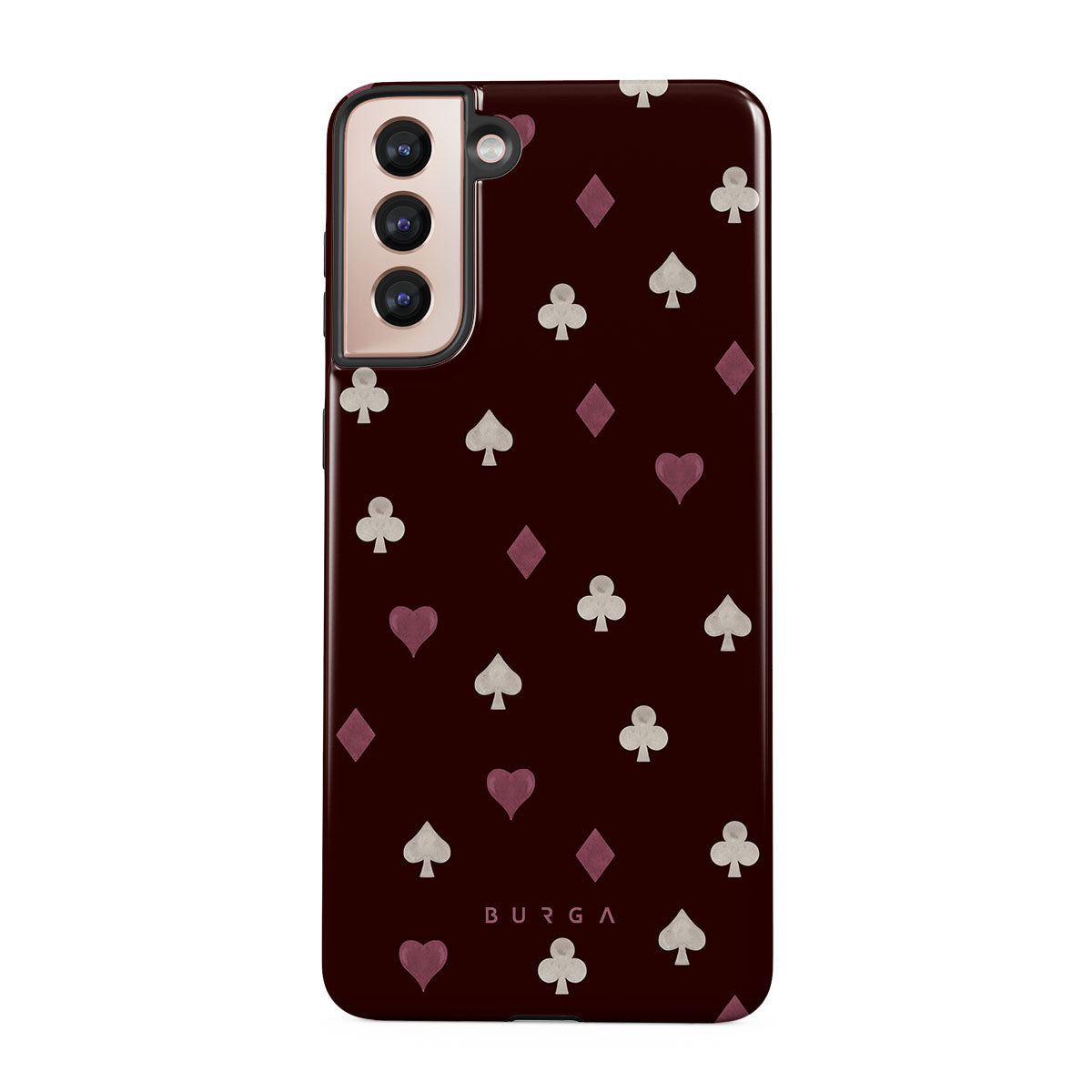Nothing is as it appears. Hearts, clubs, diamonds, and spades—stacked in your favor or playing against you? This Samsung Galaxy S21 Plus phone case design features a rich burgundy background and minimalist suits that make for a game where the rules are constantly shifting.