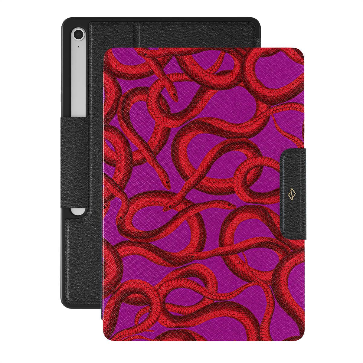 Watch Out Samsung Galaxy Tab S10+ FE folio case design offers a fierce feel with a bright magenta colored background covered in red snakes pattern. Make a statement while protecting your Galaxy Tab, as this case is guaranteed to catch everyone's eye.