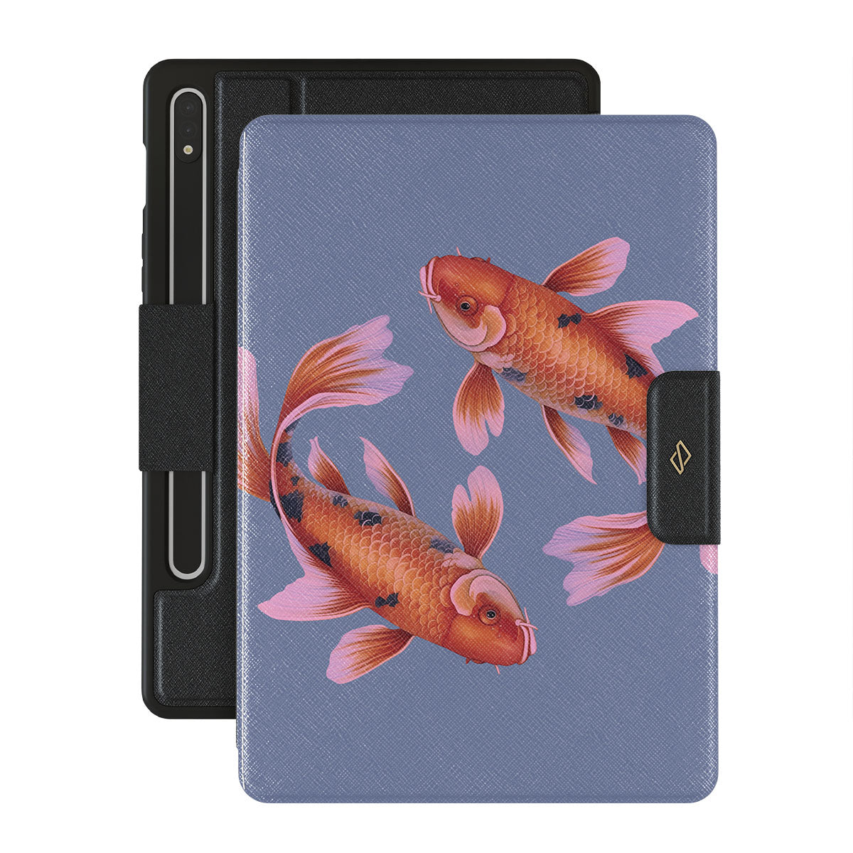 In the embrace of serene blue, the golden koi swirl, a symbol of life's fluid nature and the grace of going with the flow. Their dance is a serene meditation on the currents of destiny and the elegance of adapting with purpose. Discover our Zen Samsung Galaxy Tab S8+/S7+/S7 FE folio case design.